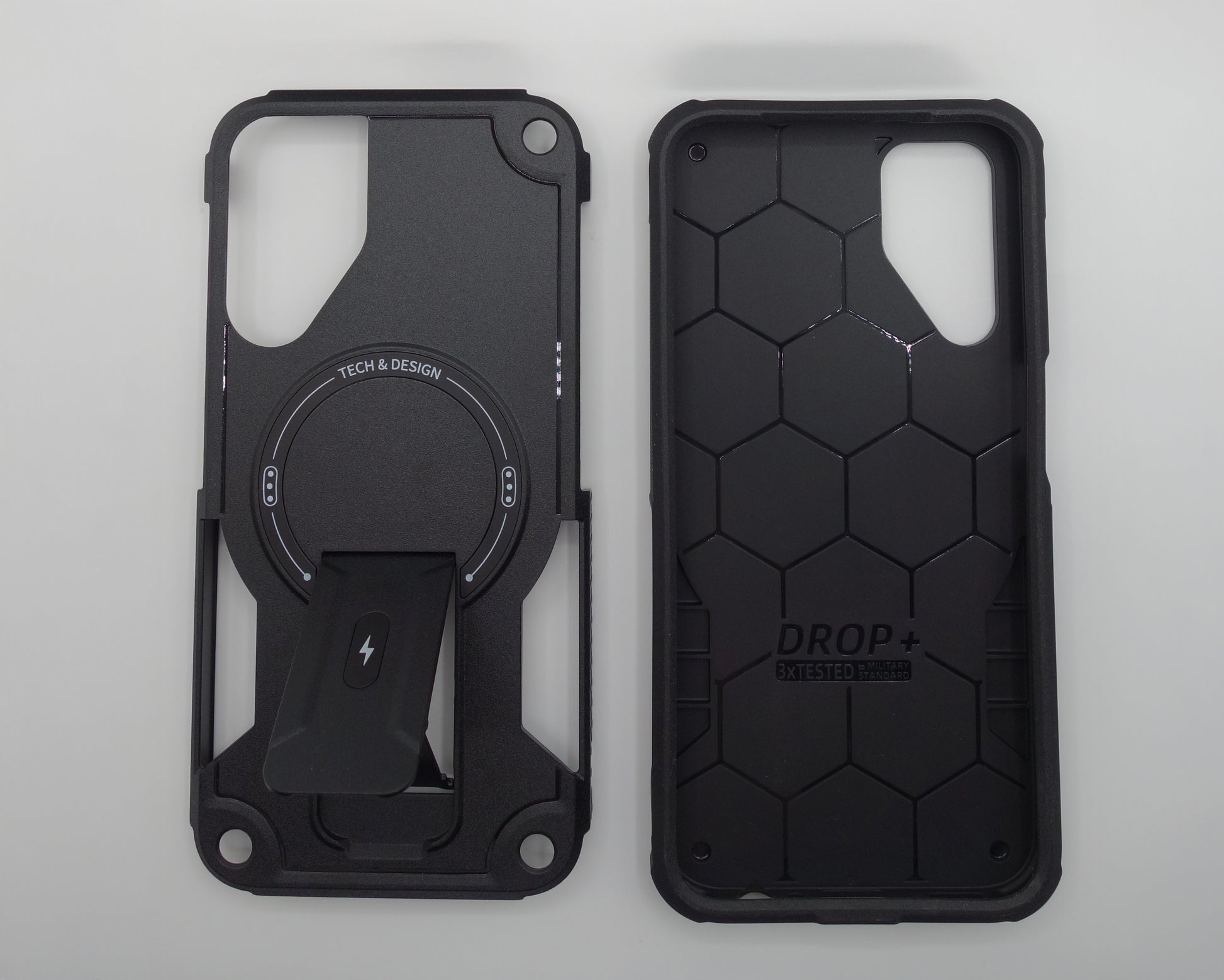 Estuche de diseño resistente con doble estructura: una capa interna de silicona flexible que absorbe impactos y una cubierta exterior de plástico rígido para máxima protección. Su sistema desmontable permite separarlo fácilmente en dos piezas. Incluye soporte trasero plegable para colocar el teléfono en posición horizontal o vertical. Compatible con cargadores y accesorios magnéticos.