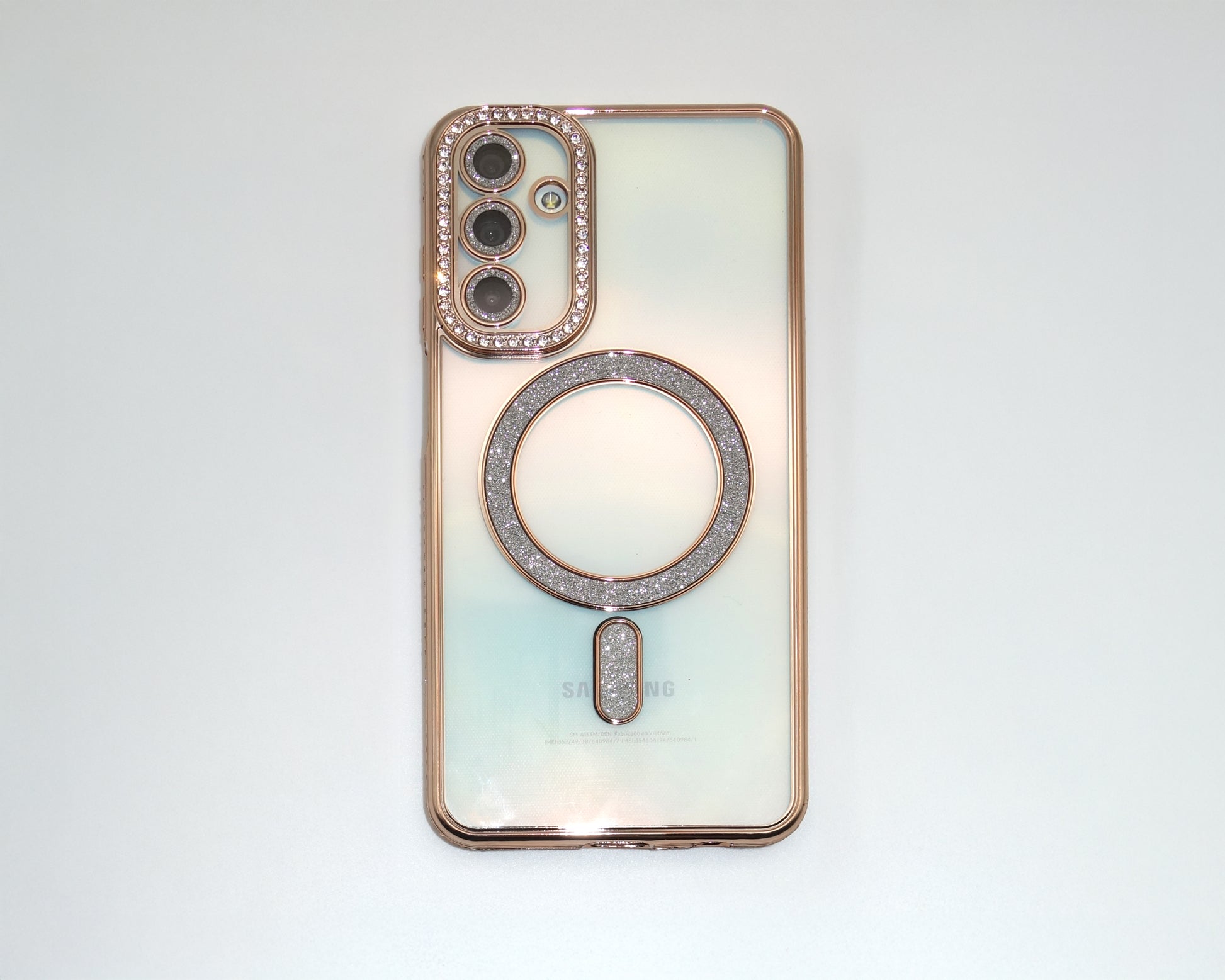 Funda protectora con diseño transparente y borde dorado con perlas. Incluye aros decorativos con incrustaciones brillantes alrededor de la cámara y en la zona central compatible con cargadores magnéticos. Ofrece un equilibrio entre protección y estilo, permitiendo lucir el diseño del teléfono mientras añade un toque elegante.
